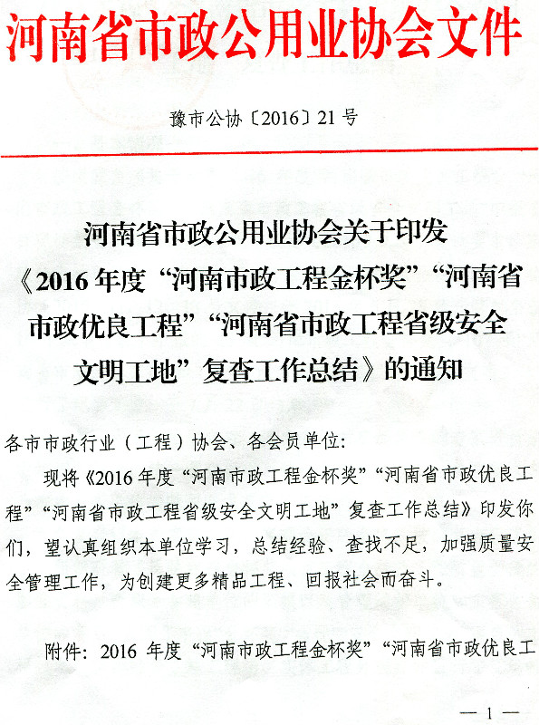 关于转发 “河南省市政公用业协会关于印发《2016年度‘河南省市政工程金杯奖’、‘河南省市政优良工程’‘河南省市政工程省级安全文明工地’复查工作总结》的通知”的通知