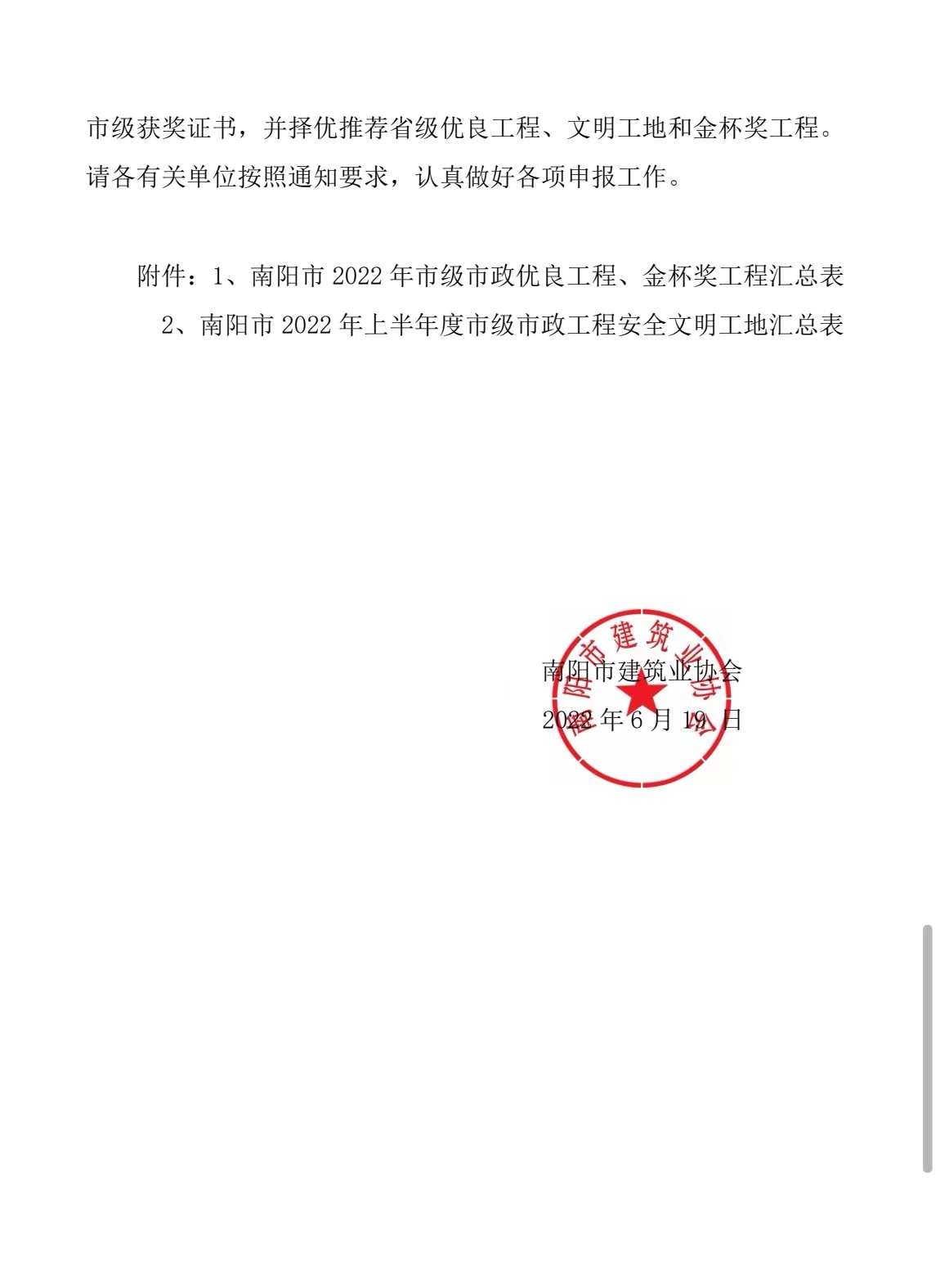 关于开展在2022年度“南阳市市政优良工程”、“南阳市市政金杯奖工程”和2022年上半年度“南阳市市政工程安全文明工地”申报工作的通知